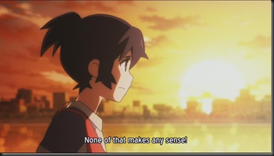 So the ‘otherworld’ is not really a metaphor of the character’s struggles in the ‘real world’ instead it really exists. So apparently if your ‘other self’ dies then the ‘real you’ will be set free from the grief but at the same time you’ll forget the source of that grief and in the case of Yomi she’ll forget Mato. That would really be convenient but it seems like in that way, your running away from your problems instead of facing them so I kind of agree with Mato’s view…Who the hell is Yuu? Why did everyone forgot about her and even Mato’s memory of her is quite fuzzy.